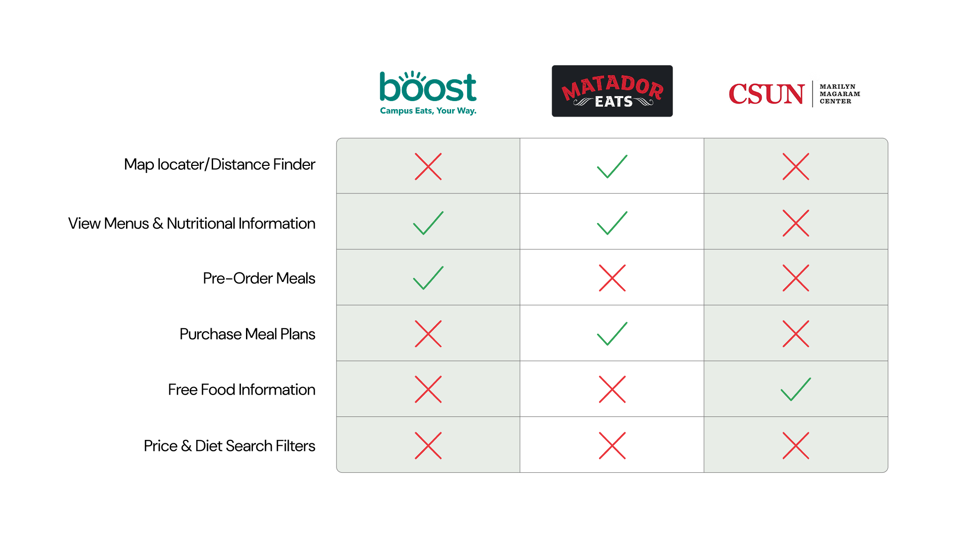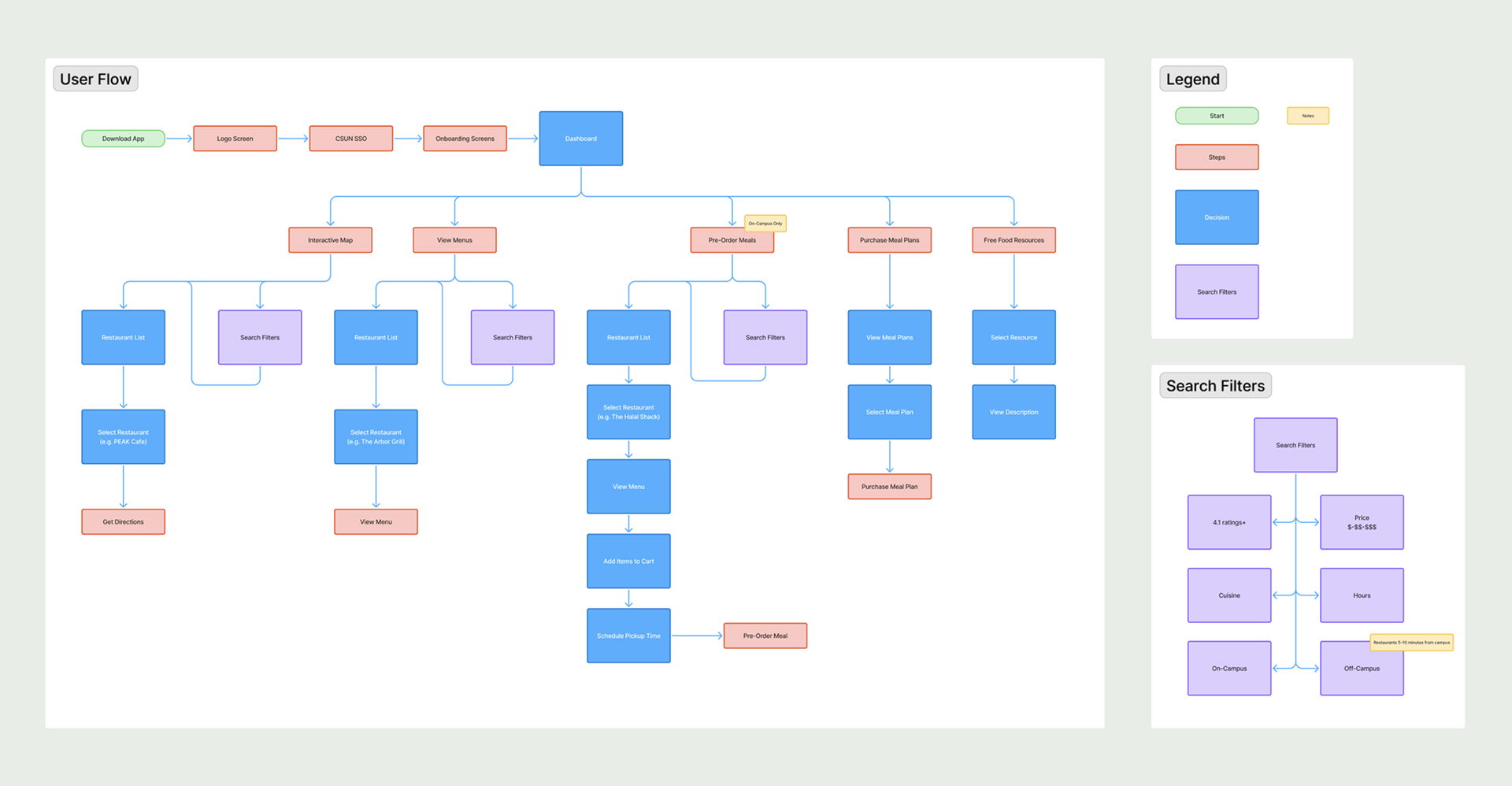 To better understand student experiences with food access on and around campus, I distributed a 10-question survey, receiving 26 total responses, and held one-on-one interviews with three CSUN students. This research helped uncover common habits, attittudes, and painpoints related to student eating routines, spending patterns, and awareness of food resources.