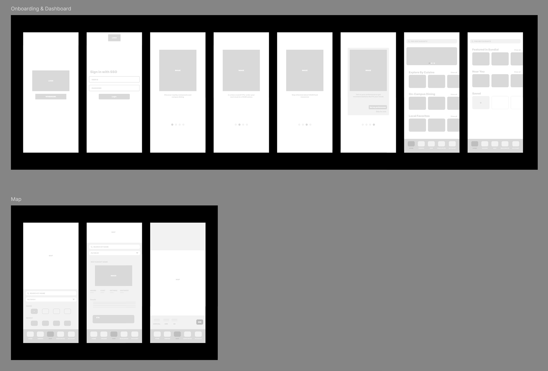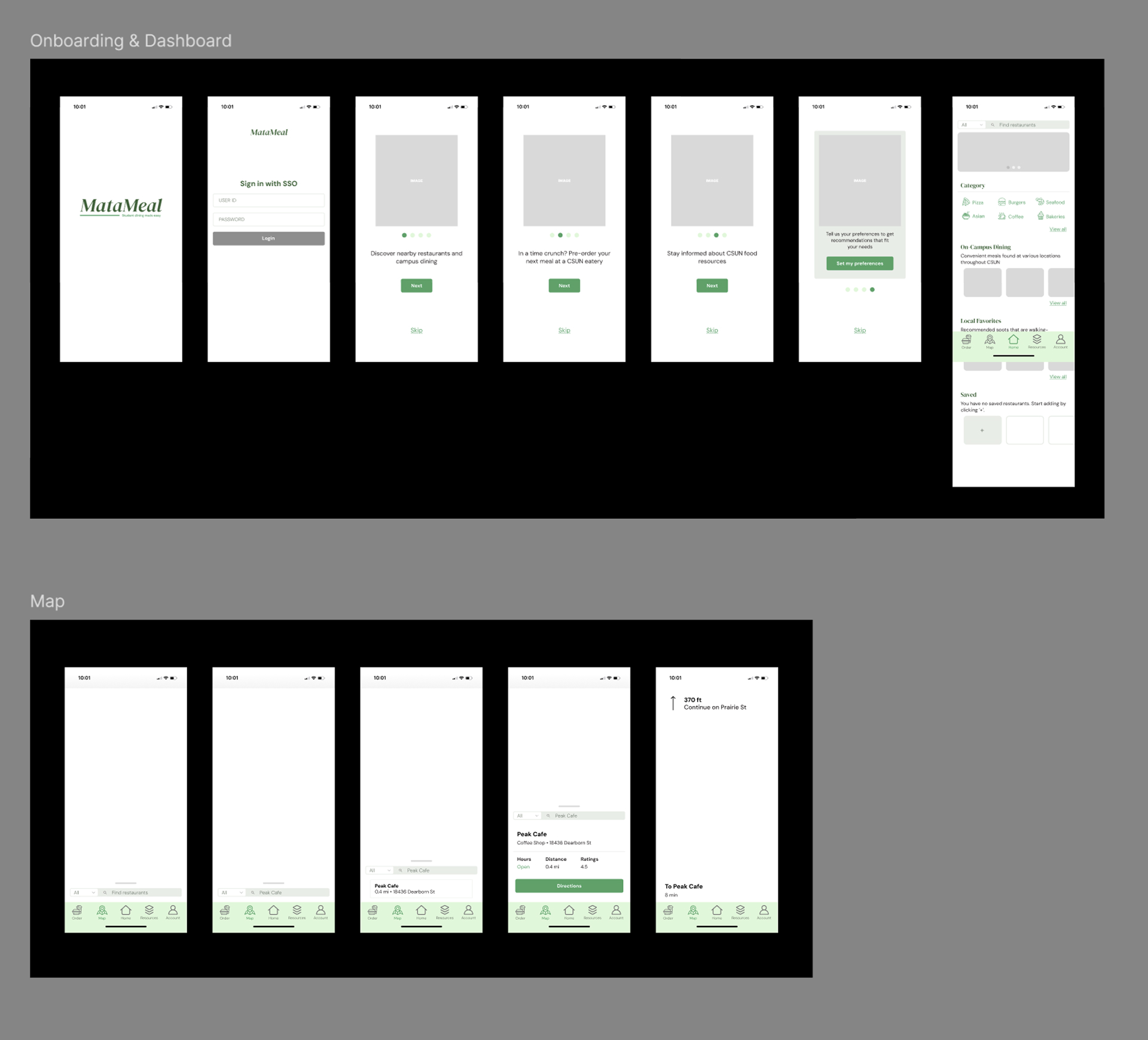 With the hifi wireframes complete, I transformed the designs into an interactive prototype. This prototype was designed to simulate a first-time user experience—from signing in with CSUN credentials, to onboarding screens that introduce the app's features and value. I also prototyped three key functions—pre-ordering meals, locating nearby dining options, and purchasing meal plans directly through the app. With the prototype in place, I was ready to begin user testing to validate the design and gather feedback.