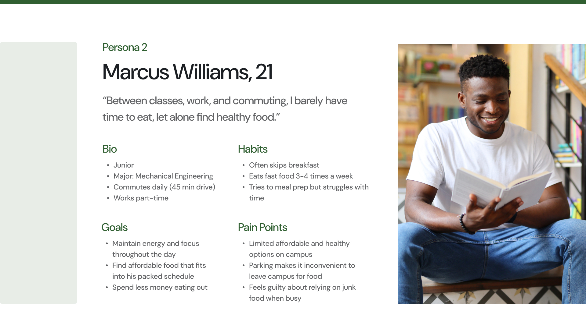 Based on these insights gathered from my research, I created user personas that reflect the varying lifestyles, priorities, and struggles students face when trying to eat well at CSUN. These personas allowed me to empathize with my user base and better visualize their day-to-day decision-making around food.