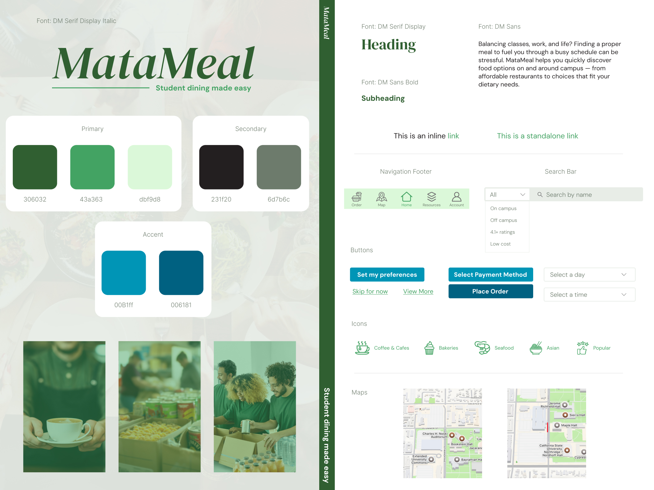After completing the midfi wireframes, I began to finalize color and UI assets by designing a UI Style Guide. Because many users expressed difficulty maintaining healthy eating habits, I chose a predominantly green color palette to evoke feelings of health, wellness, and balance. Green is also associated with calmness and reassurance—qualities that can help reduce the stress of busy students. Since MataMeal also aims to provide reliable guidance on food choices and financial resources, this color choice reinforces a sense of trust, approachability, and support throughout the user experience.