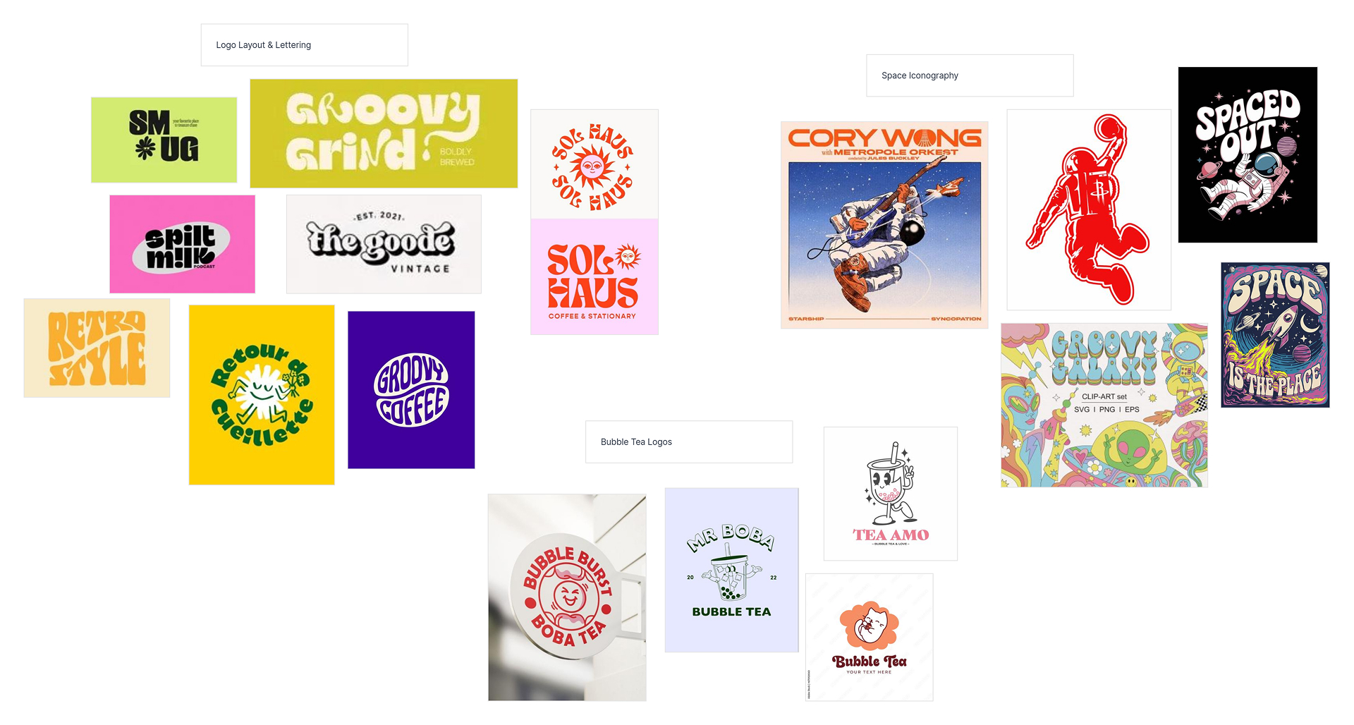 While assembling my moodboard, I explored how other designers integrated text and layout to inspire my logo composition. I gathered typography references that captured the groovy energy I envisioned. Knowing I also wanted to create a mascot, I researched iconography from existing bubble tea brands and space-themed visuals to inform my design direction.