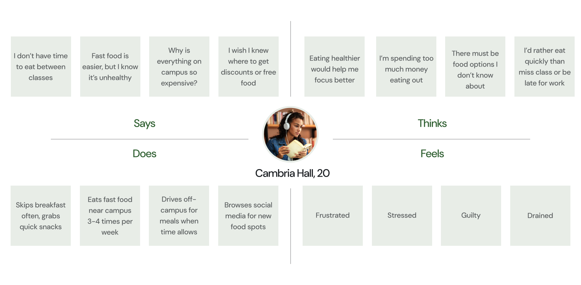 Continuing to build from these user personas, I developed an empathy map that visualizes what a student may think, feel, say, and do when it comes to food at CSUN. By visualizing their mindset and behaviors, I was able to reveal deeper frustrations, motivations, and needs that informed the direction of the app's design.