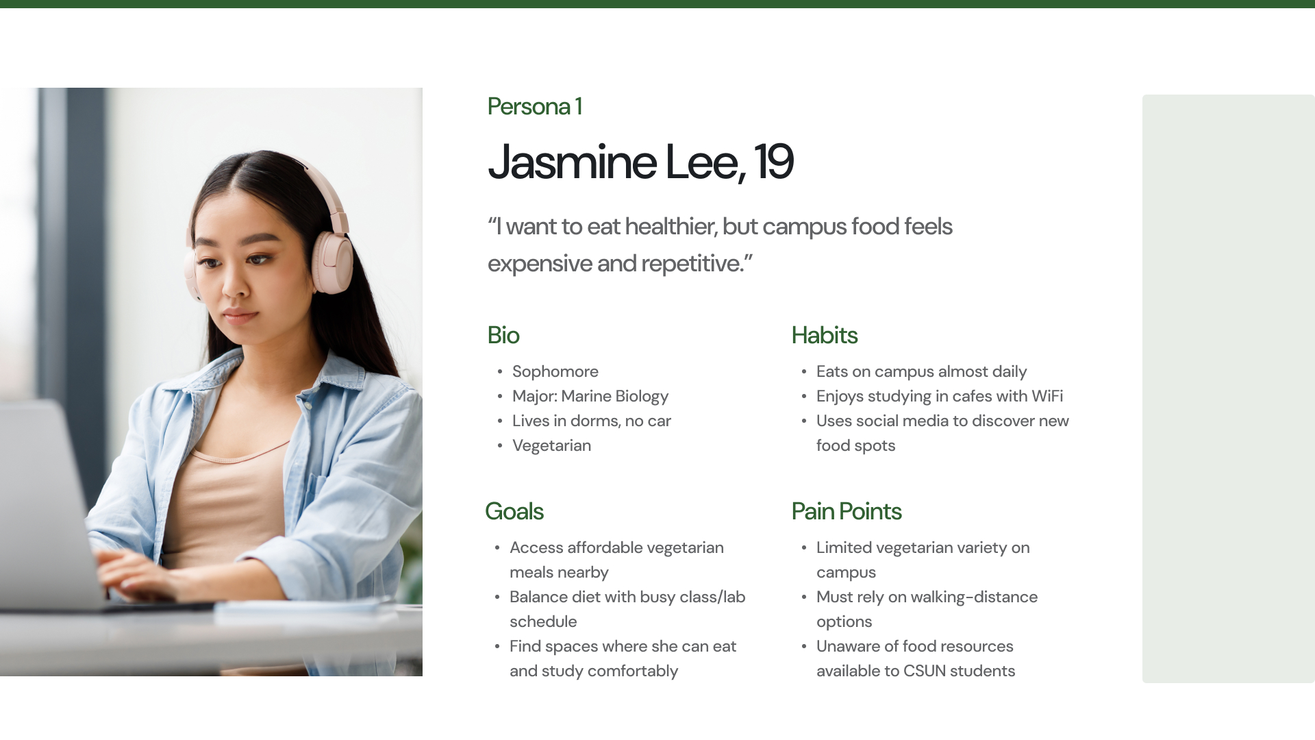 Based on these insights gathered from my research, I created user personas that reflect the varying lifestyles, priorities, and struggles students face when trying to eat well at CSUN. These personas allowed me to empathize with my user base and better visualize their day-to-day decision-making around food.