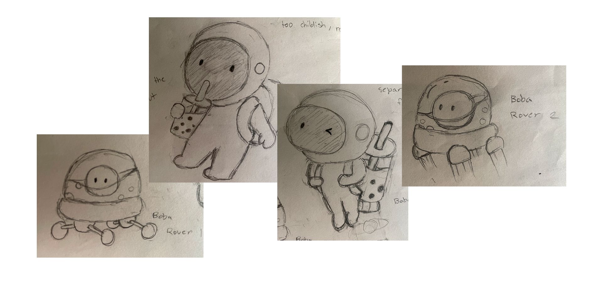 I also went through several mascot designs and poses, experimenting with different astronaut and rover concepts. With boba shops being such a saturated market where I'm located (San Fernando Valley), developing a unique and memorable personality felt essential. I looked for imaginative ways to incorporate bubble tea, leading to ideas like a boba-fueled jetpack.