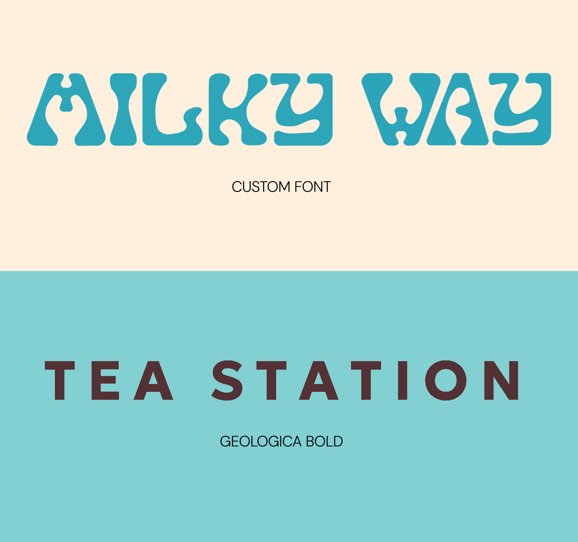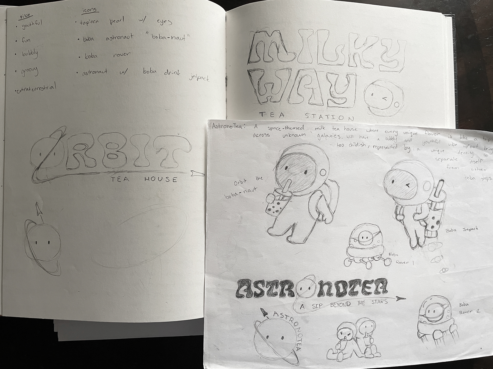 I explored several directions before finalizing a name for the brand. My first concept, Astronotea—a play on "astronomy" and "tea"—was a fun pun, but the more I said it out loud, the more I felt it lacked readability. I also considered Orbit Tea House, which felt more straightforward. Ultimately, I chose Milky Way Tea Station.